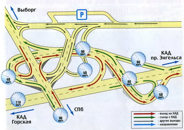 Кольцевая автомобильная дорога отвечает за необходимость разнообразных развязок, которые предусмотрены для передвижения на автомобиле. На пересечении КАД с перспективным направлением на Приозерск, схема развязки создана с классическими переходами, которые сделаны из двух уровней. На ней существуют